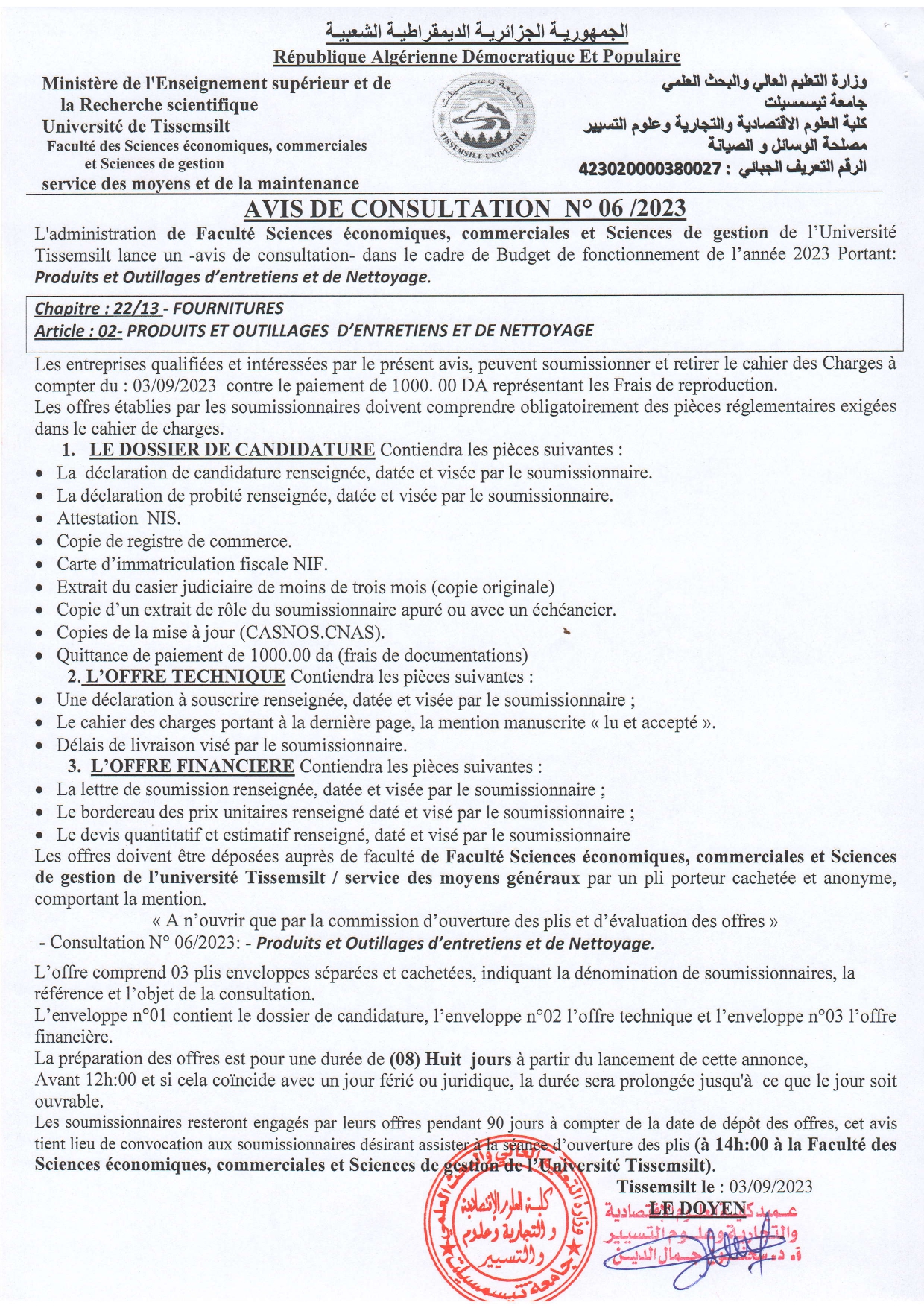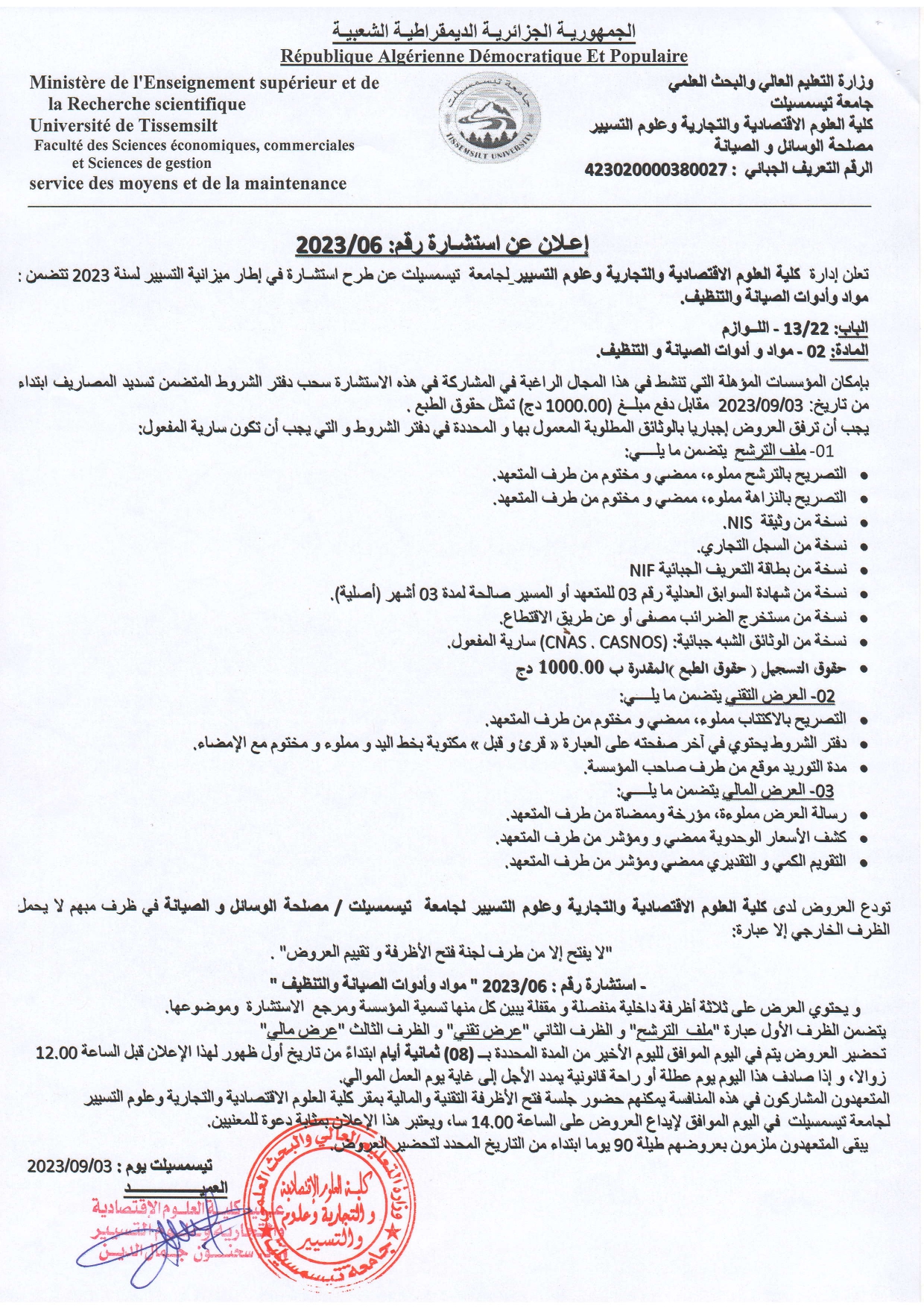 إعلان استشارة رقم 2023/06 تتضمن مواد وأدوات الصيانة والتنظيف @إعلان عن مناقصاتإعلان مهم بواسطة admin faculté SECSG آخر تحديث سبتمبر 5, 2023 934 شارك إعلان استشارة رقم 2023/06 تتضمن مواد وأدوات الصيانة والتنظيف- كليةالعلوم الإقتصادية والتجارية وعلوم التسيير لتحميل الملف بصيغة Pdf اضغط هنا لتحميل Pdf اضغط هنا 934 شارك FacebookTwitterGoogle+ReddItWhatsAppPinterestالبريد الإلكتروني