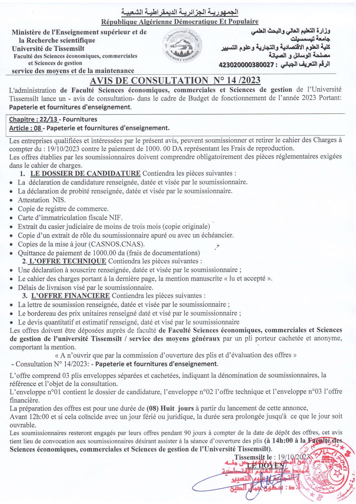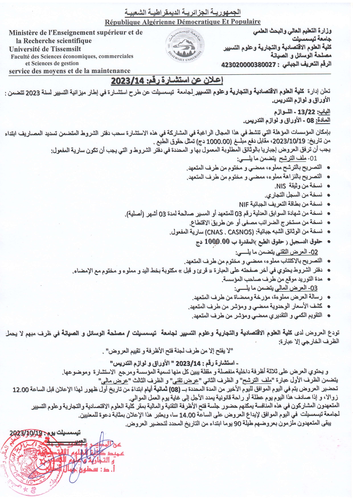 إعلان استشارة رقم 2023/14 المتضمنة اقتناء الاوراق ولوازم التدريس @إعلان عن مناقصات بواسطة admin faculté SECSG آخر تحديث أكتوبر 19, 2023 431 شارك إعلان استشارة رقم 2023/14 المتضمنة اقتناء الاوراق ولوازم التدريس- كليةالعلوم الإقتصادية والتجارية وعلوم التسيير لتحميل الملف بصيغة Pdf اضغط هنا 431 شارك FacebookTwitterGoogle+ReddItWhatsAppPinterestالبريد الإلكتروني