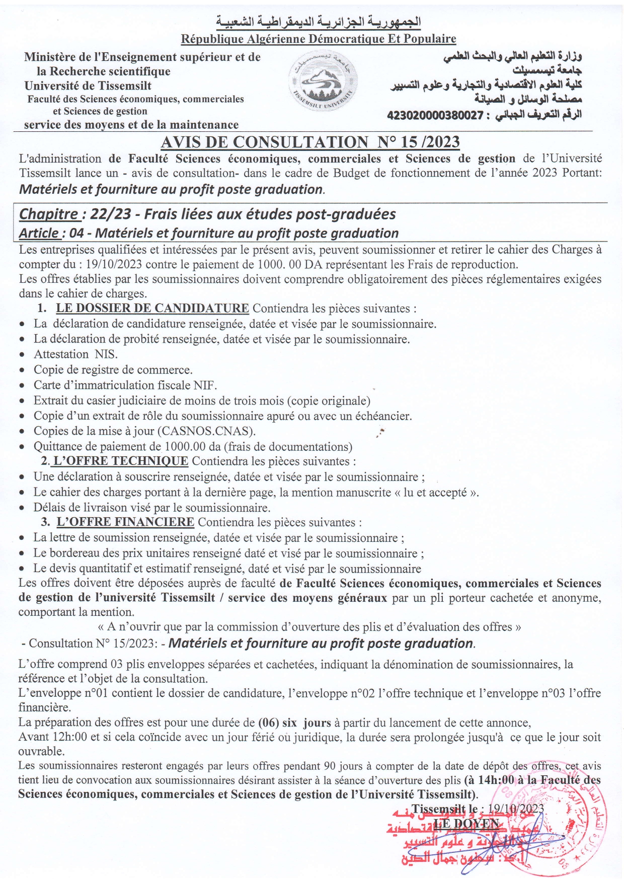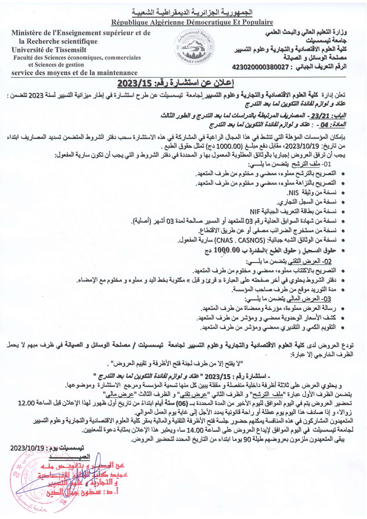 إعلان استشارة رقم 2023/15 المتضمنة اقتناء عتاد ولوازم لفائدة التكوين لما بعد التدرج @إعلان عن مناقصات بواسطة admin faculté SECSG آخر تحديث أكتوبر 19, 2023 458 شارك إعلان استشارة رقم 2023/15 المتضمنة اقتناء عتاد ولوازم لفائدة التكوين لما بعد التدرج- كليةالعلوم الإقتصادية والتجارية وعلوم التسيير لتحميل الملف بصيغة Pdf اضغط هنا 458 شارك FacebookTwitterGoogle+ReddItWhatsAppPinterestالبريد الإلكتروني