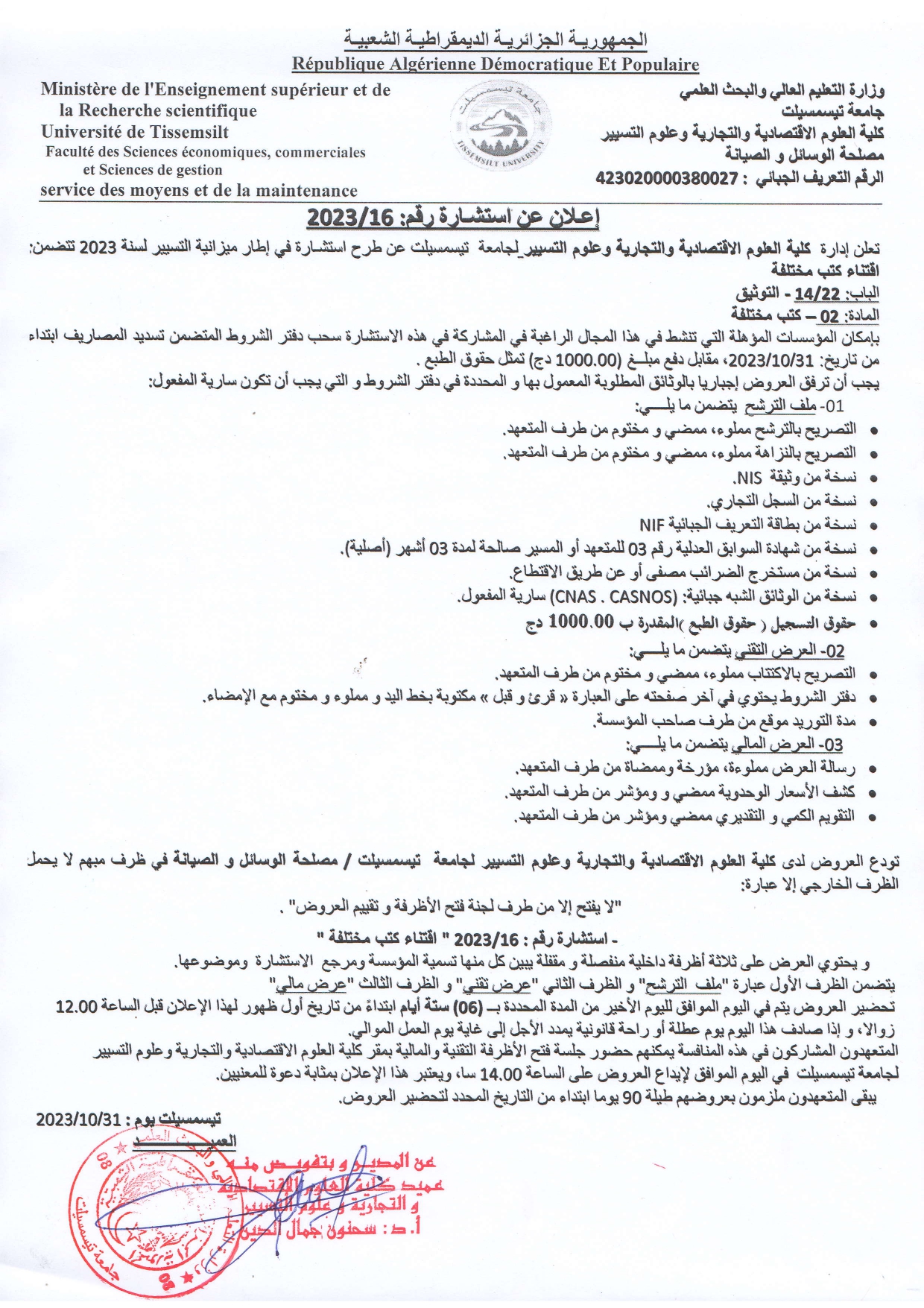 إعلان استشارة رقم 2023/16 المتضمنة اقتناء كتب مختلفة @إعلان عن مناقصات بواسطة admin faculté SECSG آخر تحديث نوفمبر 6, 2023 440 شارك إعلان استشارة رقم 2023/16 المتضمنة اقتناء كتب مختلفة- كليةالعلوم الإقتصادية والتجارية وعلوم التسيير لتحميل الملف بصيغة Pdf اضغط هنا 440 شارك FacebookTwitterGoogle+ReddItWhatsAppPinterestالبريد الإلكتروني