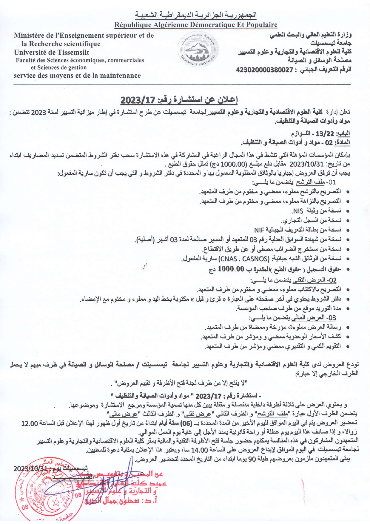 إعلان استشارة رقم 2023/17  المتضمنة مواد وادوات الصيانة والتنظيف- كليةالعلوم الإقتصادية والتجارية وعلوم التسيير