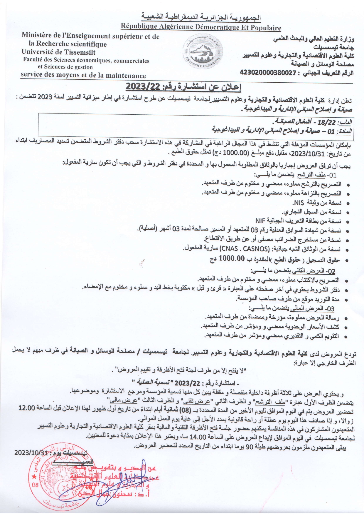 إعلان استشارة رقم 2023/22 المتضمنة صيانة وإصلاح المباني الإدارية والبيداغوجية @إعلان عن مناقصات بواسطة admin faculté SECSG في نوفمبر 6, 2023 539 شارك إعلان استشارة رقم 2023/22 المتضمنة صيانة وإصلاح المباني الإدارية والبيداغوجية- كليةالعلوم الإقتصادية والتجارية وعلوم التسيير لتحميل الملف بصيغة Pdf اضغط هنا 539 شارك FacebookTwitterGoogle+ReddItWhatsAppPinterestالبريد الإلكتروني