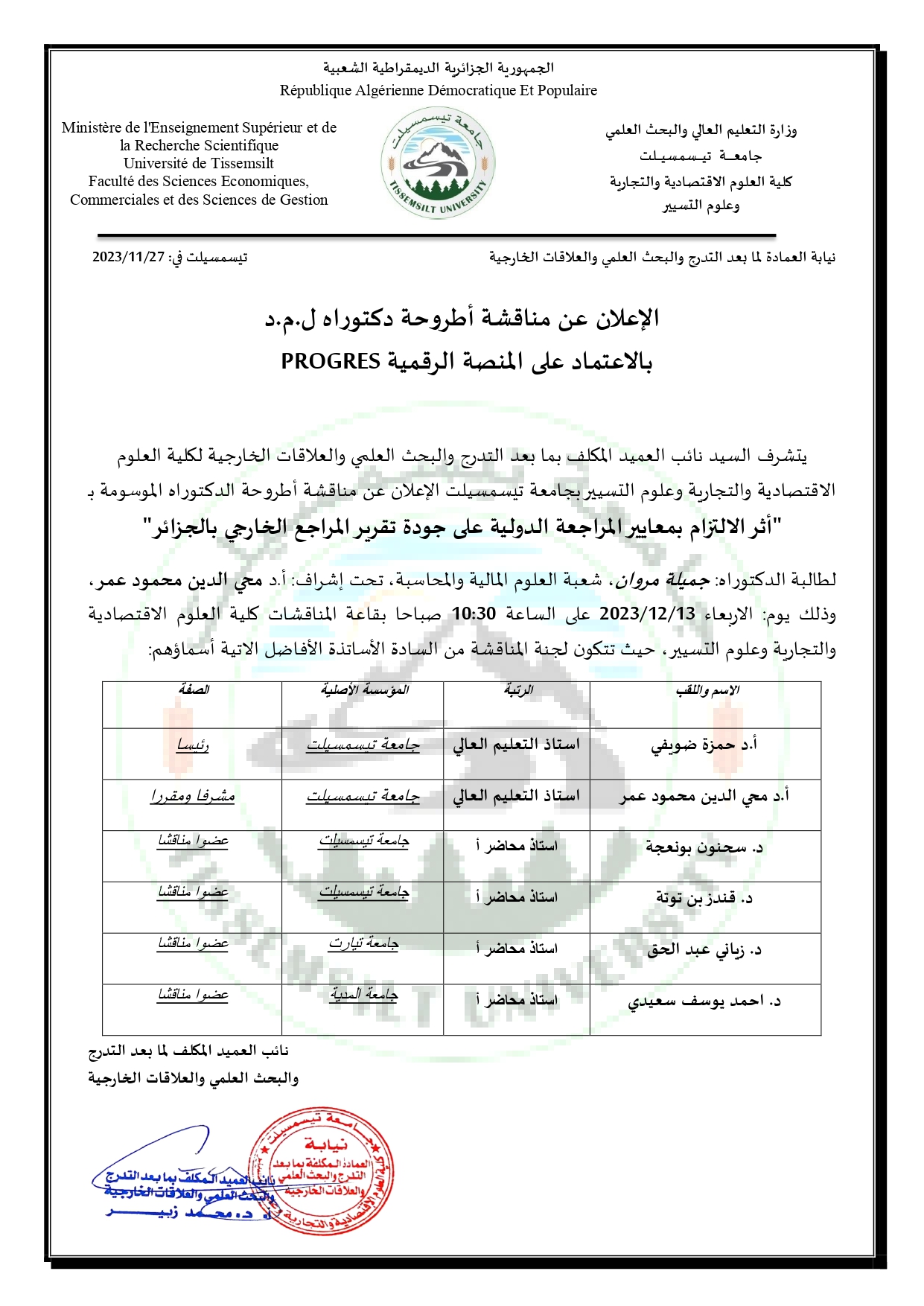 إعلان عن مناقشة أطروحة دكتوراه ل.م.د للطالبة ” مروان جميلة”