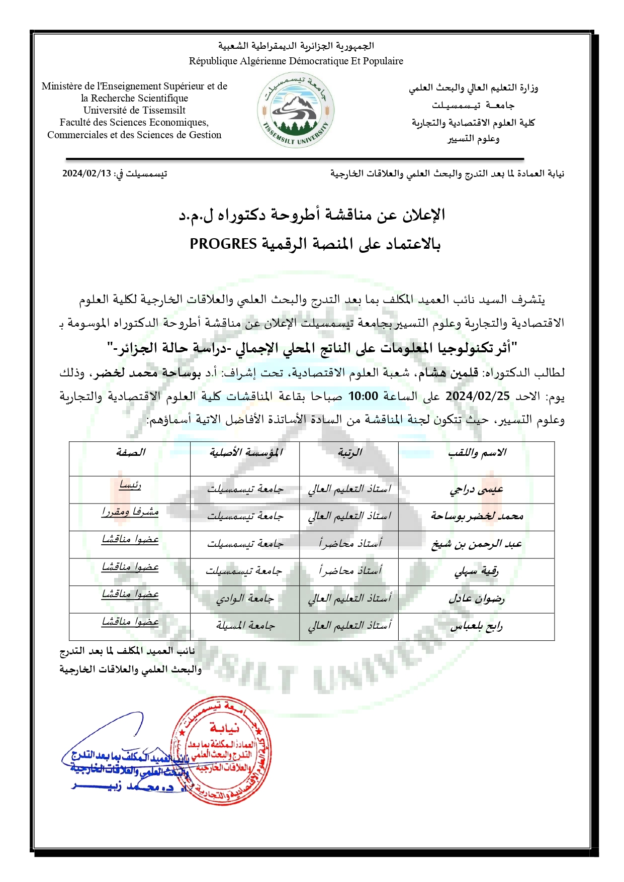 يناقش الطالب “قلمين هشام” أطروحة دكتوراه في العلوم الإقتصادية والتجارية وعلوم التسيير، شعبة العلوم الاقتصادية، يوم الأحد 25 فيفري 2024 على الساعة 10:00 صباحا بكلية العلوم الاقتصادية والتجارية وعلوم التسيير، قاعة المناقشات.