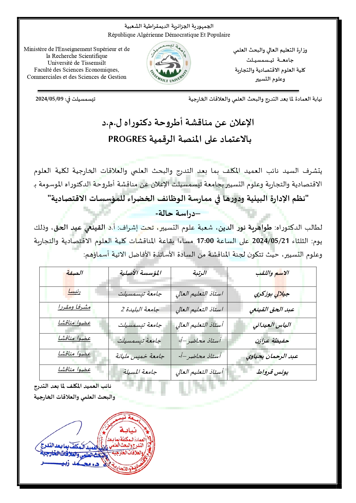 يناقش الطالب “طواهرية نور الدين” أطروحة دكتوراه في العلوم الإقتصادية والتجارية وعلوم التسيير، شعبة علوم التسيير، يوم الثلاثاء 21 ماي 2024 على الساعة 17:00 مساءا بكلية العلوم الاقتصادية والتجارية وعلوم التسيير، قاعة المناقشات.
