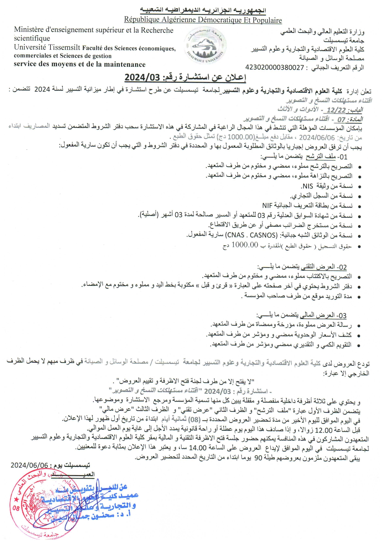 إعلان استشارة رقم 2024/03 المتضمنة اقتناء مستهلكات النسخ والتصوير @إعلان عن مناقصات بواسطة admin faculté SECSG في يونيو 9, 2024 403 شارك إعلان استشارة رقم 2024/03 المتضمنة اقتناء مستهلكات النسخ والتصوير – كليةالعلوم الإقتصادية والتجارية وعلوم التسيير لتحميل الملف بصيغة Pdf اضغط هنا 403 شارك FacebookTwitterGoogle+ReddItWhatsAppPinterestالبريد الإلكتروني