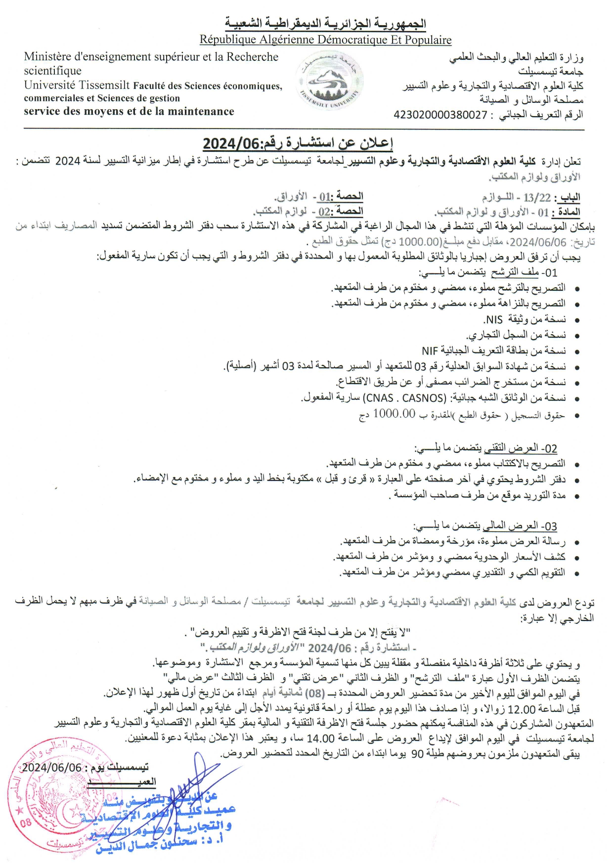 إعلان استشارة رقم 2024/06 المتضمنة اقتناء الأوراق ولوازم المكتب @إعلان عن مناقصات بواسطة admin faculté SECSG آخر تحديث يونيو 9, 2024 453 شارك إعلان استشارة رقم 2024/06 المتضمنة اقتناء الأوراق ولوازم المكتب – كليةالعلوم الإقتصادية والتجارية وعلوم التسيير لتحميل الملف بصيغة Pdf اضغط هنا 453 شارك FacebookTwitterGoogle+ReddItWhatsAppPinterestالبريد الإلكتروني
