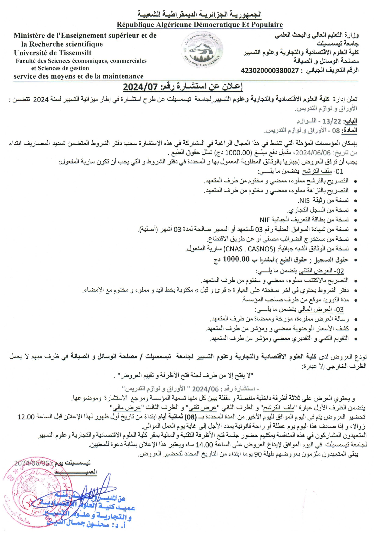 إعلان استشارة رقم 2024/07 المتضمنة اقتناء الأوراق ولوازم التدريس @إعلان عن مناقصات بواسطة admin faculté SECSG في يونيو 9, 2024 586 شارك إعلان استشارة رقم 2024/07 المتضمنة اقتناء الأوراق ولوازم التدريس – كليةالعلوم الإقتصادية والتجارية وعلوم التسيير لتحميل الملف بصيغة Pdf اضغط هنا 586 شارك FacebookTwitterGoogle+ReddItWhatsAppPinterestالبريد الإلكتروني