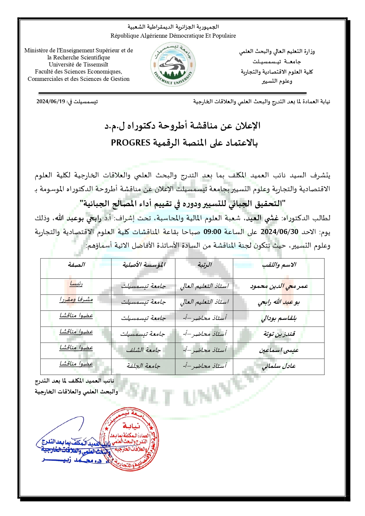 يناقش الطالب “غشي العيد” أطروحة دكتوراه في العلوم الإقتصادية والتجارية وعلوم التسيير، شعبة العلوم المالية والمحاسبة، يوم الأحد 30 جوان 2024 على الساعة 09:00 صباحا بكلية العلوم الاقتصادية والتجارية وعلوم التسيير، قاعة المناقشات.