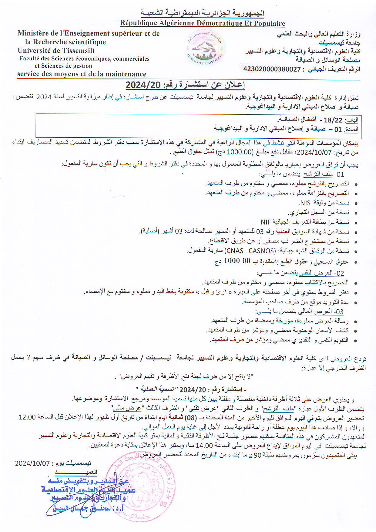 إعلان استشارة رقم 2024/20 المتضمنة صيانة واصلاح المباني الادارية والبيداغوجية @إعلان عن مناقصات بواسطة admin faculté SECSG في أكتوبر 9, 2024 382 شارك لتحميل الملف بصيغة Pdf اضغط هنا 382 شارك FacebookTwitterGoogle+ReddItWhatsAppPinterestالبريد الإلكتروني