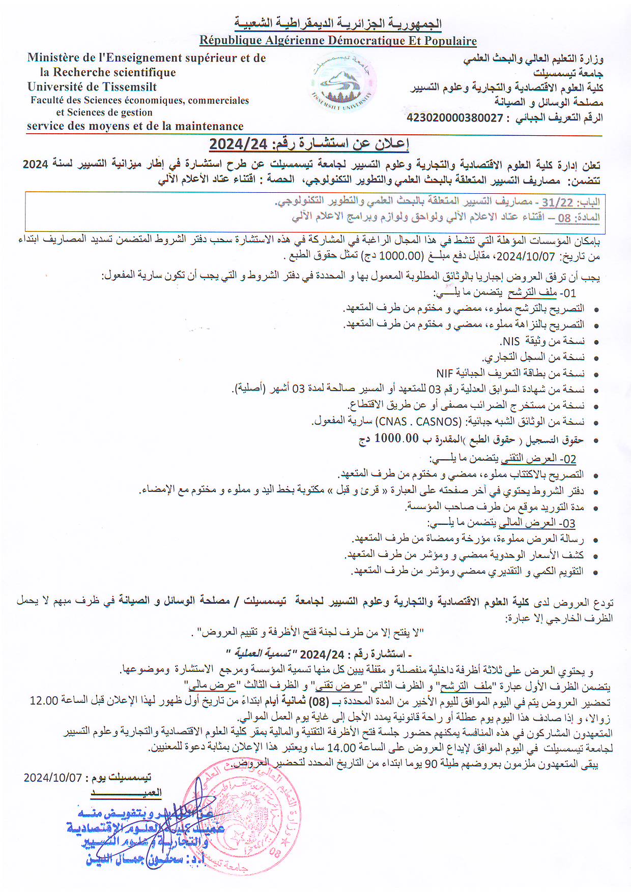 إعلان استشارة رقم 2024/24 المتضمنة مصاريف التسيير المتعلقة بالبحث العلمي والتطوير التكنولوجي – الحصة: اقتناء عتاد الاعلام الآلي @إعلان عن مناقصات بواسطة admin faculté SECSG في أكتوبر 9, 2024 481 شارك لتحميل الملف بصيغة Pdf اضغط هنا 481 شارك FacebookTwitterGoogle+ReddItWhatsAppPinterestالبريد الإلكتروني