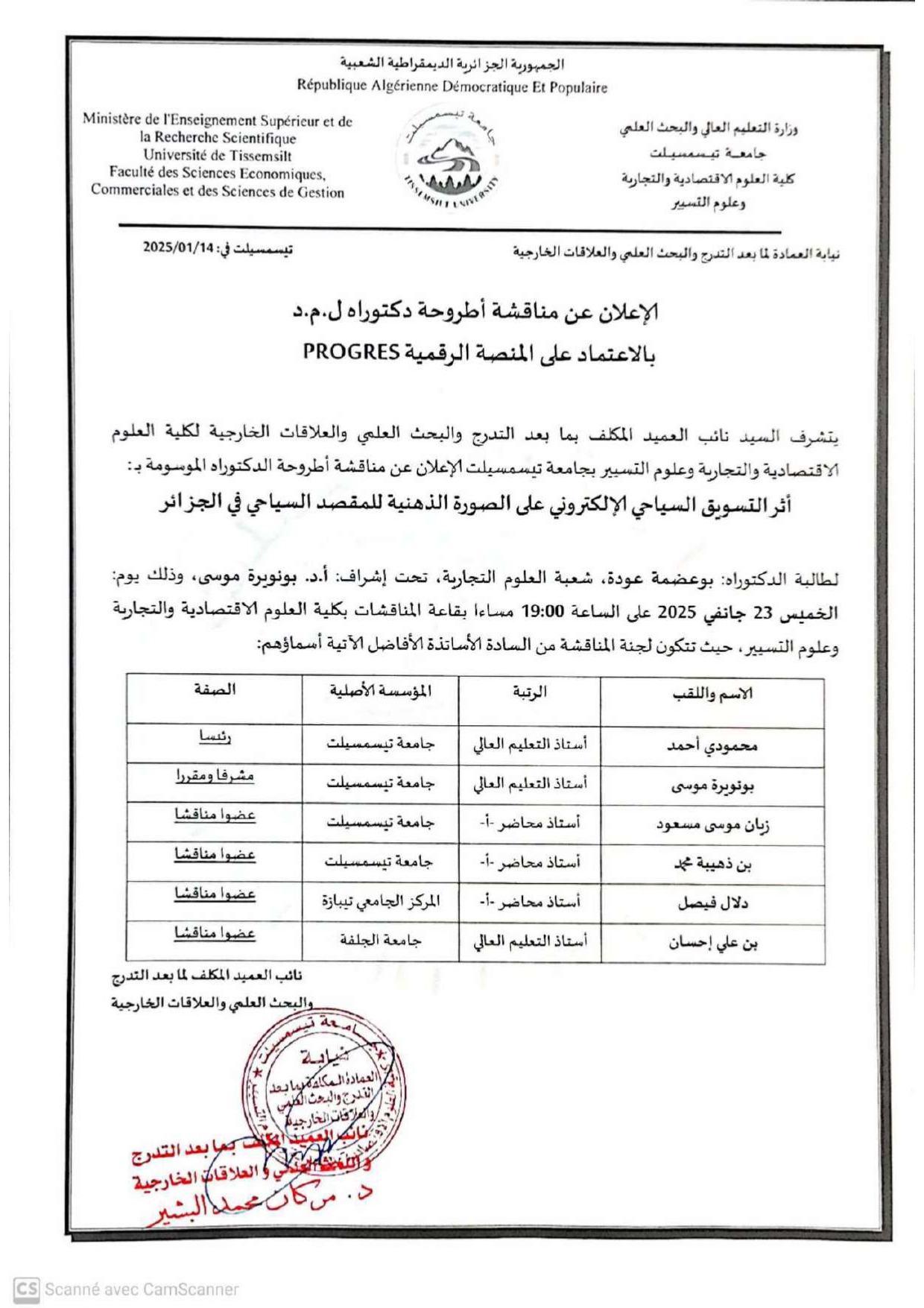 تناقش الطالبة “بوعضمة عودة” أطروحة دكتوراه في العلوم الإقتصادية والتجارية وعلوم التسيير، شعبة العلوم التجارية، يوم الخميس 23 جانفي 2025 على الساعة 19:00 مساءا بكلية العلوم الاقتصادية والتجارية وعلوم التسيير، قاعة المناقشات.