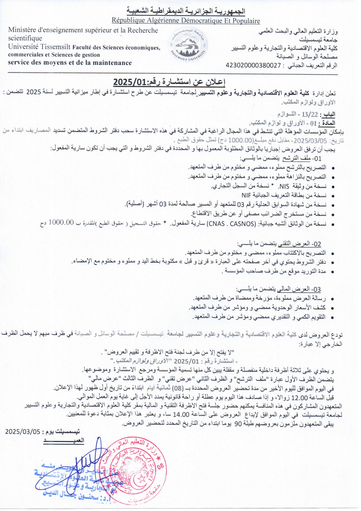 إعلان استشارة رقم 2025/01 المتضمنة اقتناء الأوراق ولوازم المكتب @إعلان عن مناقصات بواسطة admin faculté SECSG آخر تحديث مارس 12, 2025 367 شارك إعلان استشارة رقم 2025/01 المتضمنة اقتناء الأوراق ولوازم المكتب- كليةالعلوم الإقتصادية والتجارية وعلوم التسيير لتحميل الملف بصيغة Pdf اضغط هنا 367 شارك FacebookTwitterGoogle+ReddItWhatsAppPinterestالبريد الإلكتروني